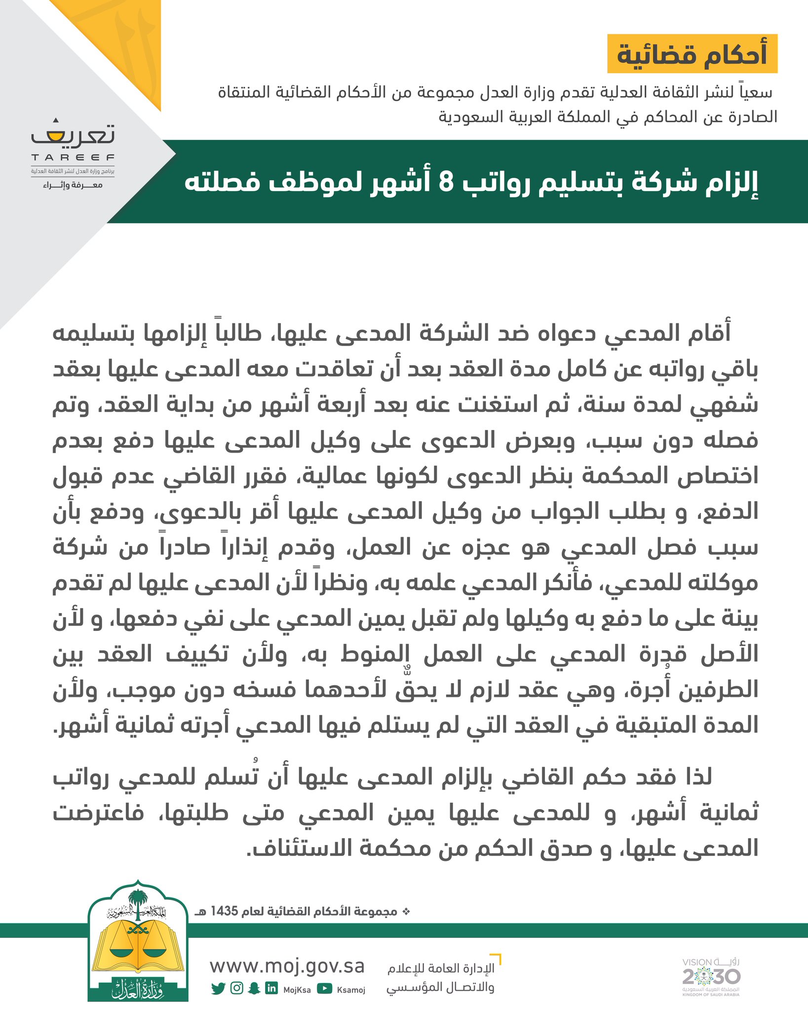 وزارة العدل Sur Twitter أحكام قضائية إلزام شركة بتسليم رواتب 8 أشهر لموظف فصلته