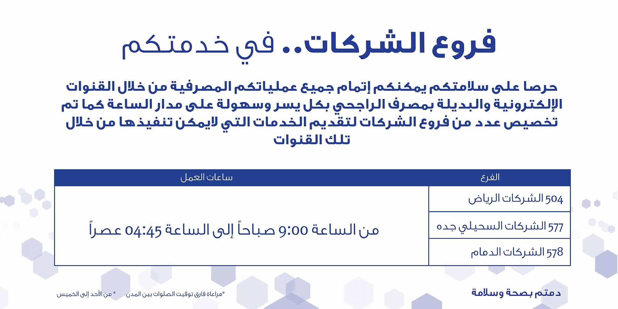 مصرف الراجحي On Twitter فروع الشركات في خدمتكم وحرصا على سلامتكم يمكنكم إتمام جميع العمليات من خلال القنوات الالكترونية صحتكم تاجنا