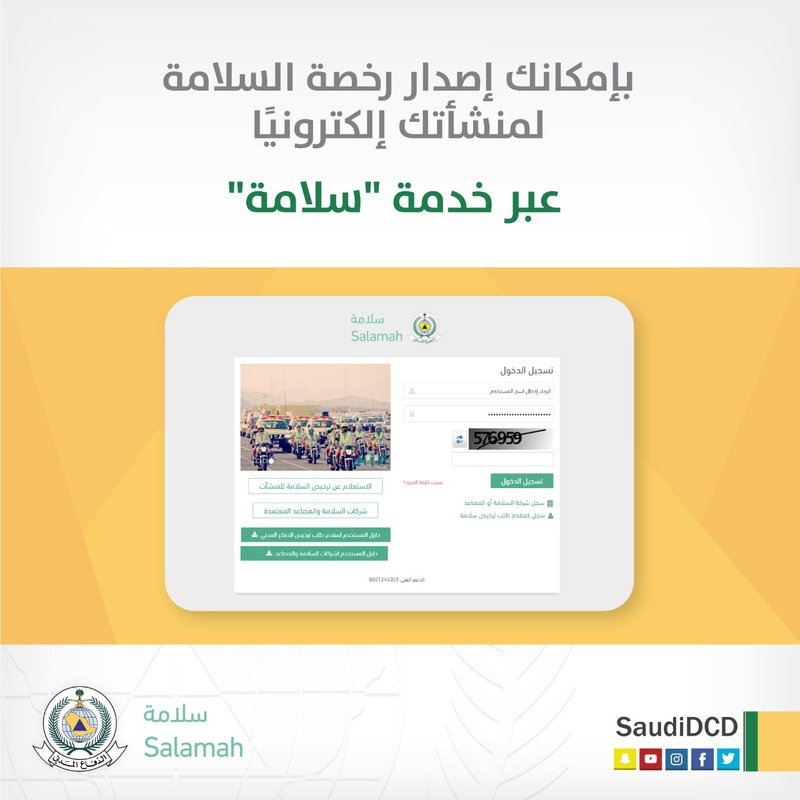 الدفاع المدني السعودي On Twitter حماية منشأتكم بين أيديكم خدمة سلامة لإصدار تراخيص الدفاع المدني للمنشآت إلكتروني ا Https T Co 14ugdi582k سلامتنا وسلامة منشآتنا Https T Co Haqa7chawz